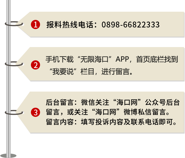 海口網“記者幫幫幫”專欄,面向社會征集鮮活、有料的海口地區新聞線索,我們將安排記者進行核實并跟進報道。你有“料”我有“獎”,我們將根據報料情況,適當給予一定的現金獎勵,歡迎大家踴躍來料。